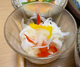 パプリカと一緒にオリーブオイル、酢、塩胡椒、レモン汁を混ぜ合わせた液に漬け込みました。